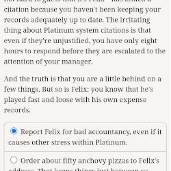 حالة النخبة: الكونسيرج البلاتيني هي دراما تفاعلية معاصرة مكونة من 500000 كلمة من تأليف إميلي شورت ، مع محتوى إضافي من تأليف هاريس باول سميث ، حيث تتحكم اختياراتك في القصة. إنها تعتمد بالكامل على النص - بدون رسومات أو مؤثرات صوتية - وتغذيها قوة خيالك الهائلة التي لا يمكن إيقافها.