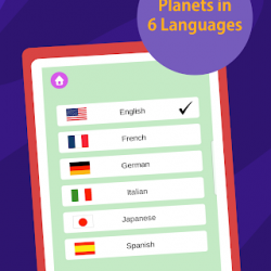 - تتم تسمية الكواكب بست لغات (6): الإنجليزية والفرنسية والالمانية والإيطالية واليابانية والإسبانية. وهذا يسمح للطفل بتعلم أكثر من 30 كلمة أجنبية ، والتي ستكون مفيدة جدًا لمواصلة دراسة اللغات. يتم نطق كل كلمة بشكل واضح ومميز إلى جانب كيفية تهجئتها.