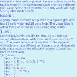 لعبت اللعبه مع 100 البلاط بالضبط. تحتوي 98 قطعة من هذه المربعات على أحرف عليها ، بينما يوجد مربعا جوكر عليها علامة *. يحل الجوكر محل أي حرف في الابجدية. تحتوي الاحرف المختلفة على قيم نقاط مختلفة ، اعتمادًا على ندرة الحرف وصعوبة تشغيله. بلاط جوكر ليس له قيمة نقطية.